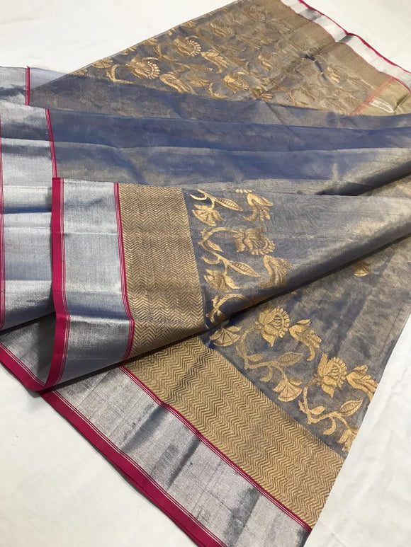 Grey and red chanderi tissue silk saree from aunthentic chanderi weavers.This elegantly designed saree comes with golden floral patterns and silver and gold zari.