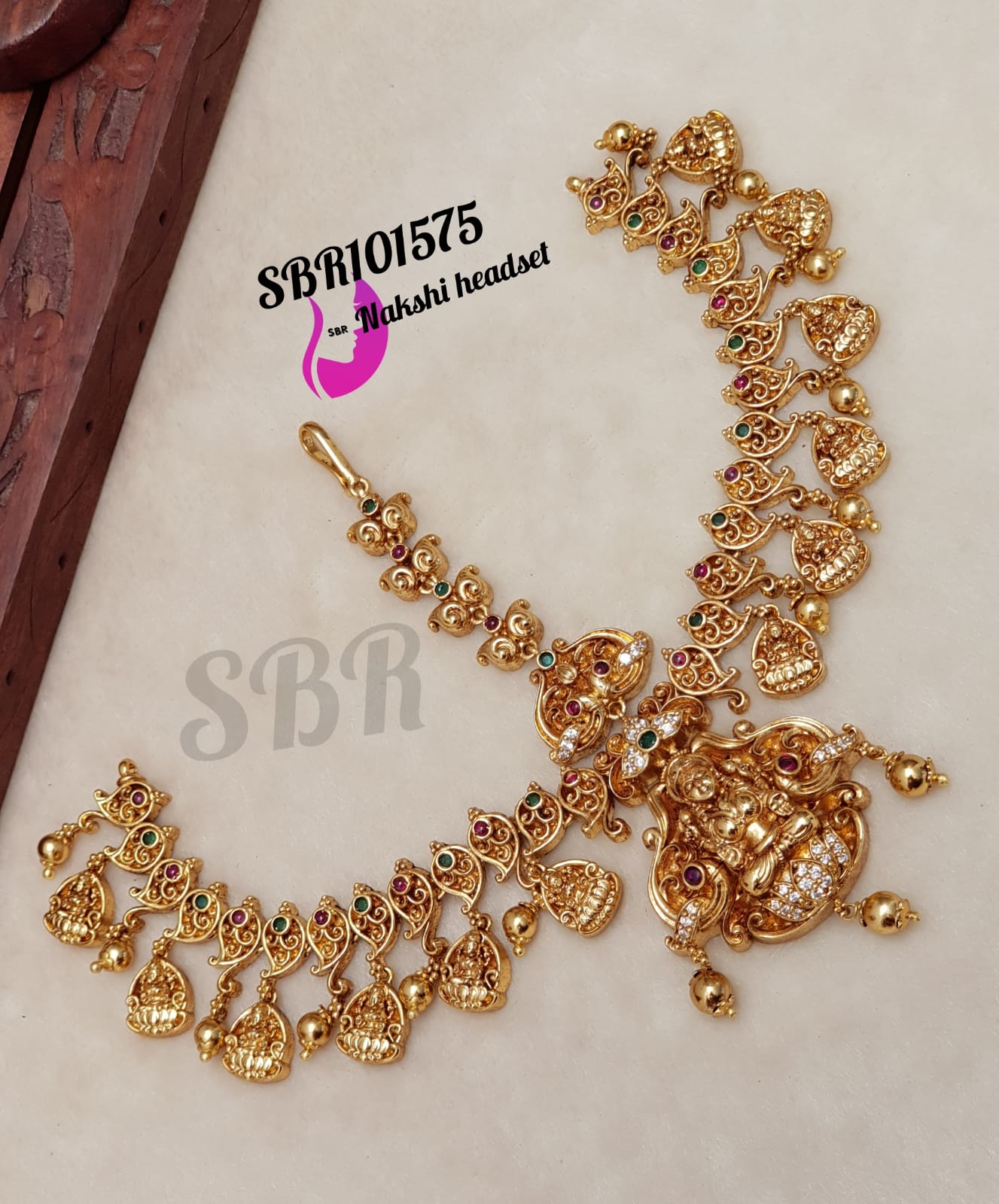HASINI, GOLD PLATED LAKSHMI DESIGNER BRIDAL MAANGTIKKA WITH WHITE STONES AND GOLD BEAD HANGINGS FOR WOMEN