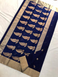 Indigo blue chanderi silk cotton saree with silver leaf motifs from authentic certified chanderi silk weavers