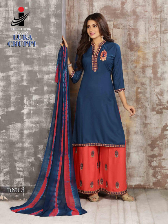 Description-: Heavy Reyon Plain Top With Embroidery Work ,Heavy Reyon Plain Palazzos With Embroidery Work & Nazneen Shibori Dyed Dupatta.