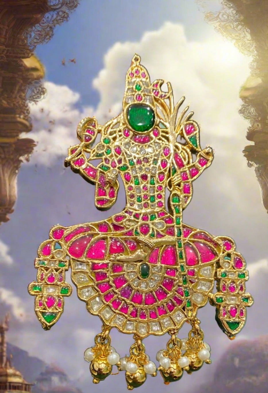 Experience elegance and tradition with our Madura Meenakshi Amman Gold Finish Big Size Kemp Pendant. Designed for women, this statement pendant features intricate Jadau details and a bold 3.6 inch length. Elevate your look with this timeless piece of jewelry.