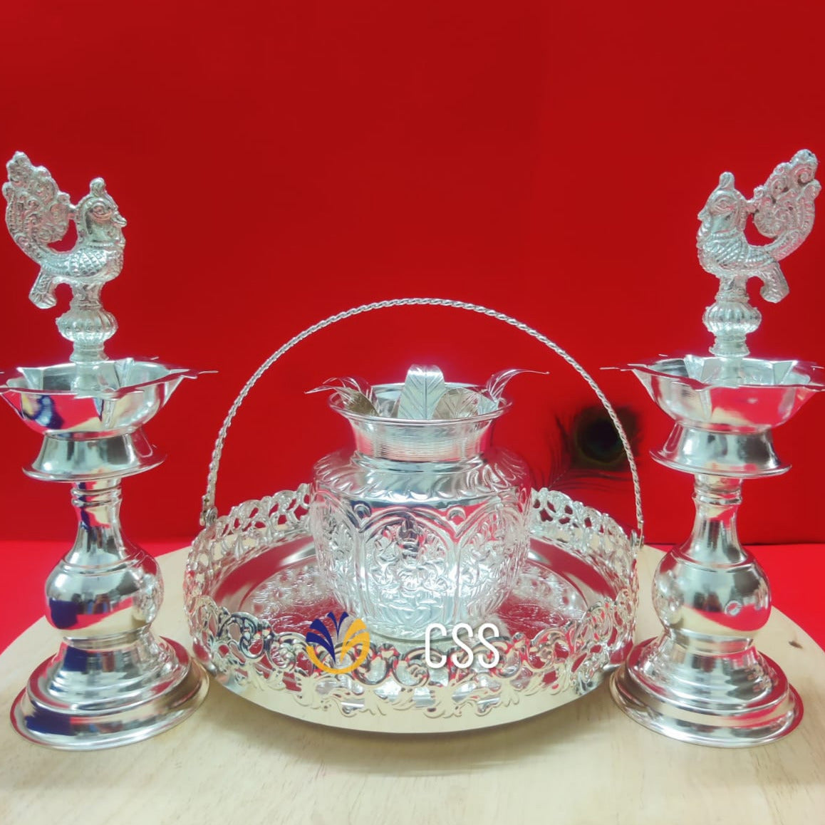 MAMTA, GERMAN SILVER TRAY WITH KALASH AND PEACOCK LAMPS-CZY001PS