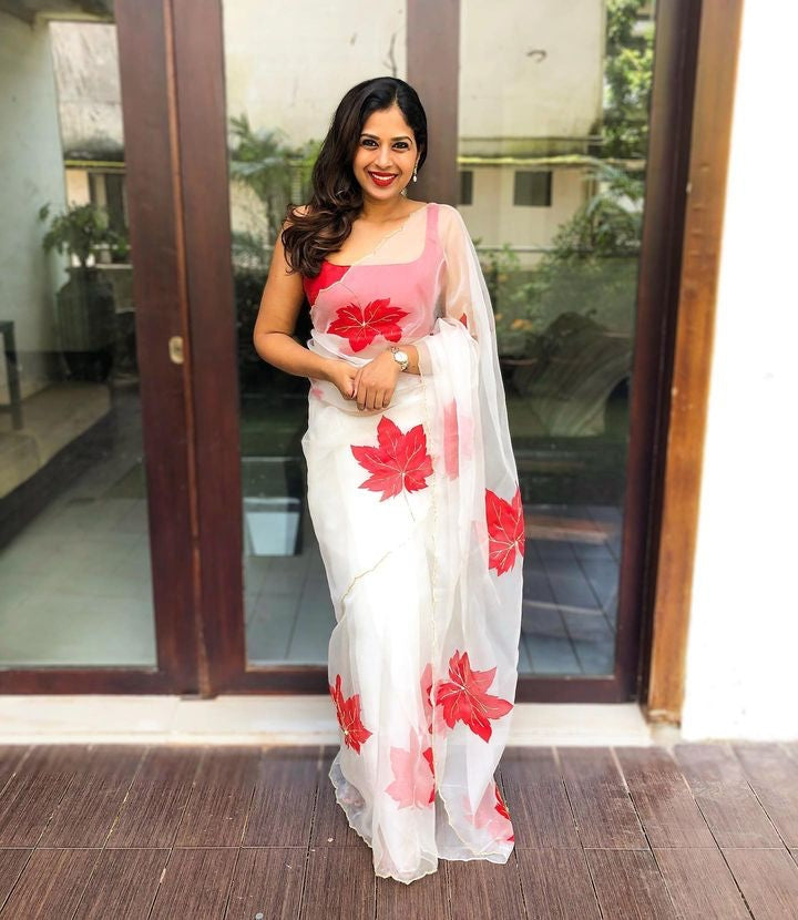 Maples Beauty , Red Maples  design White Organza Saree with Blouse-SHRI001WO