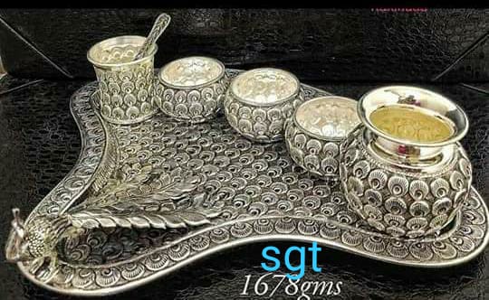Hnad crafted Thali with a Beautiful Peacock standing on the Thali and peacock Feather designs on Thali and Kalash ,Haldi Kumkum bowls and Panchapatra
