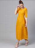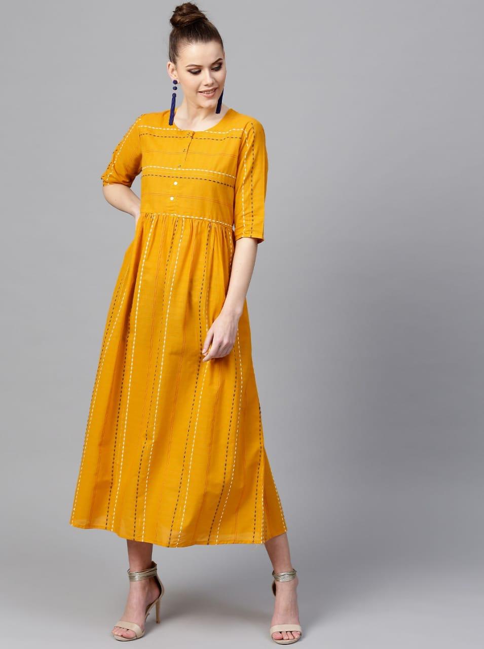 Mustard A-line cotton dress with self Khatta work & round neck.