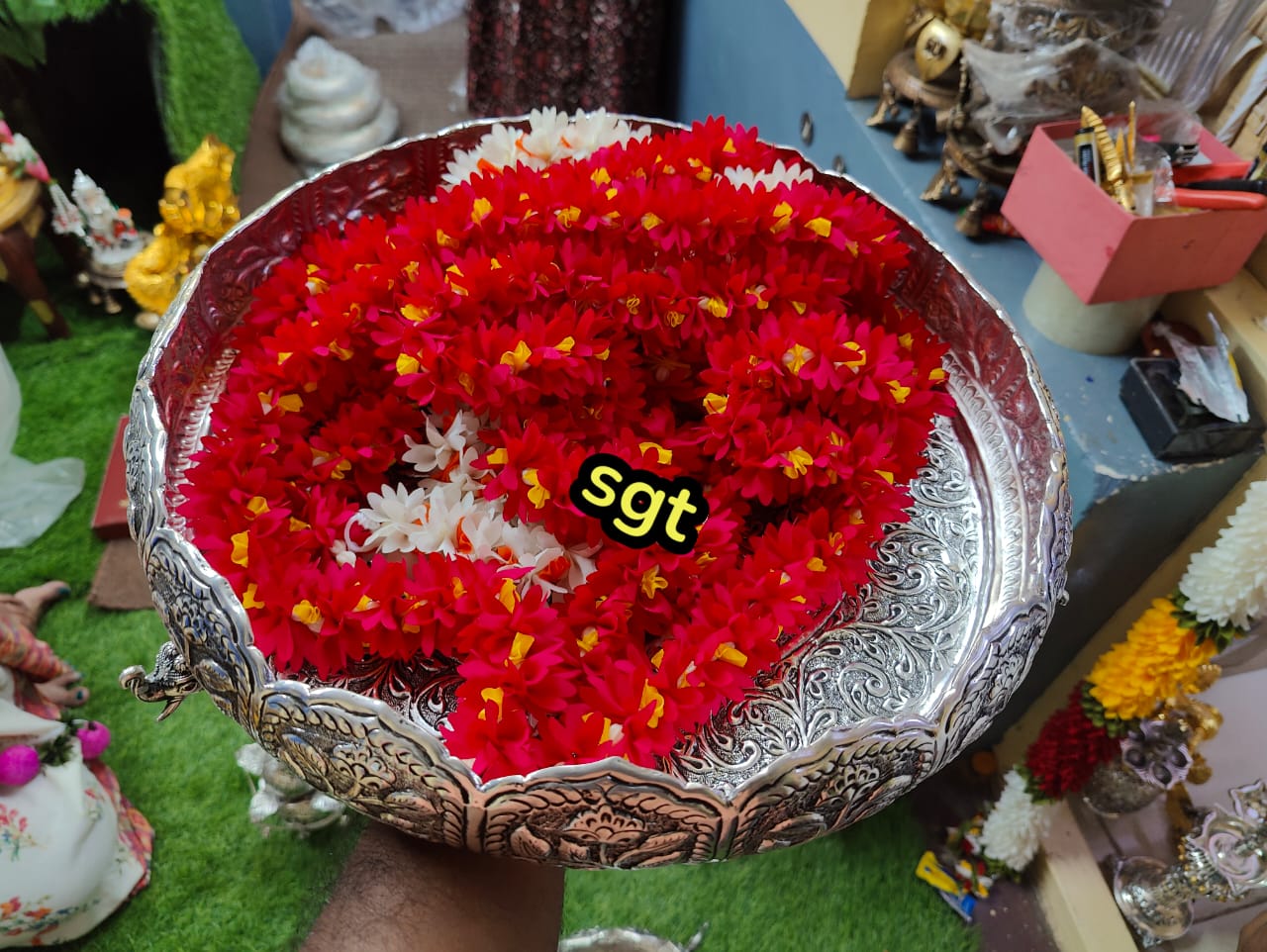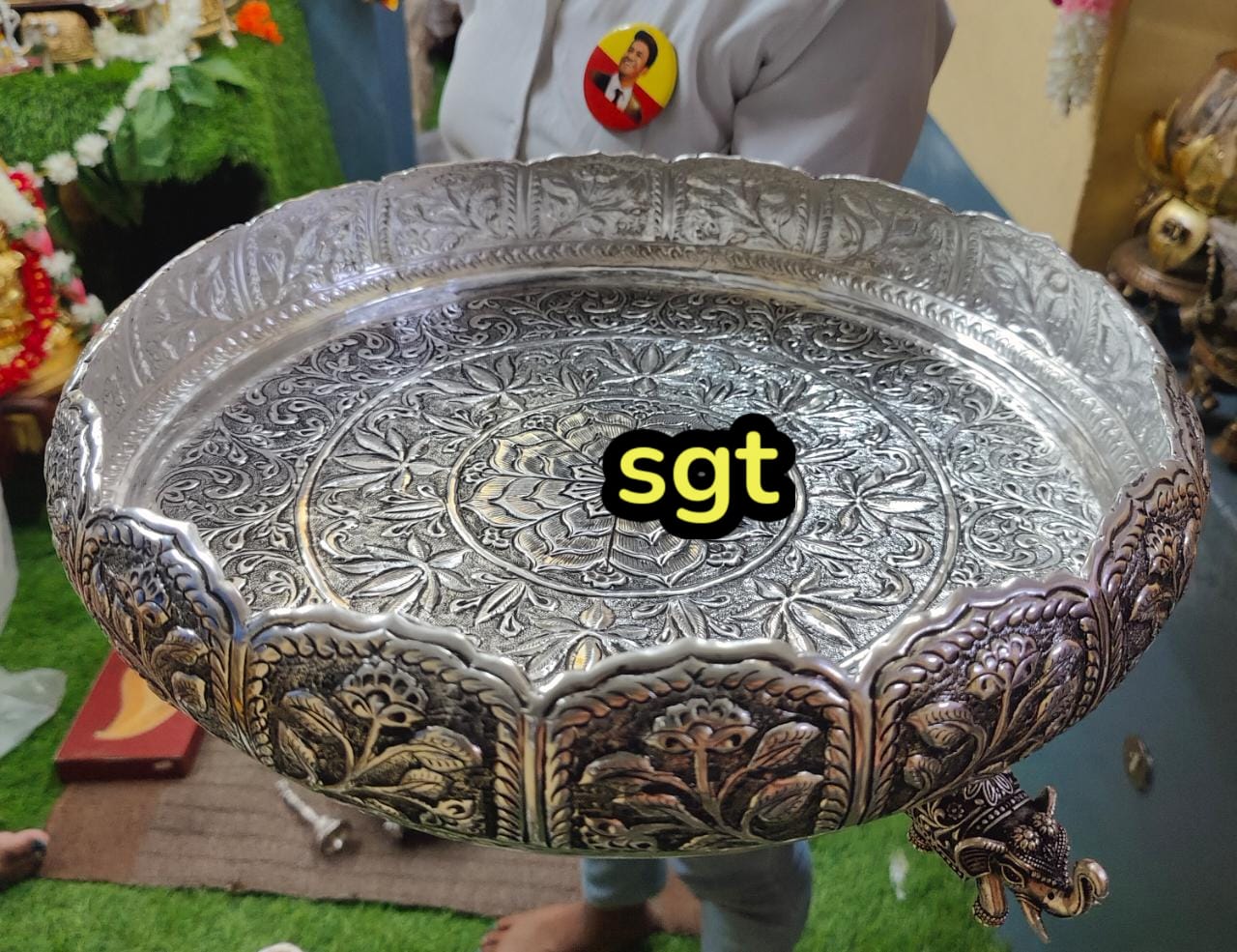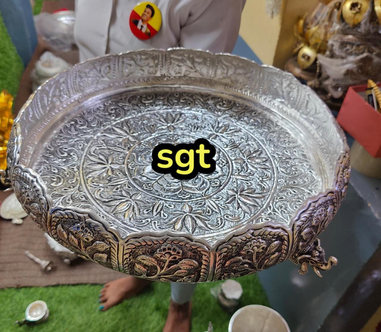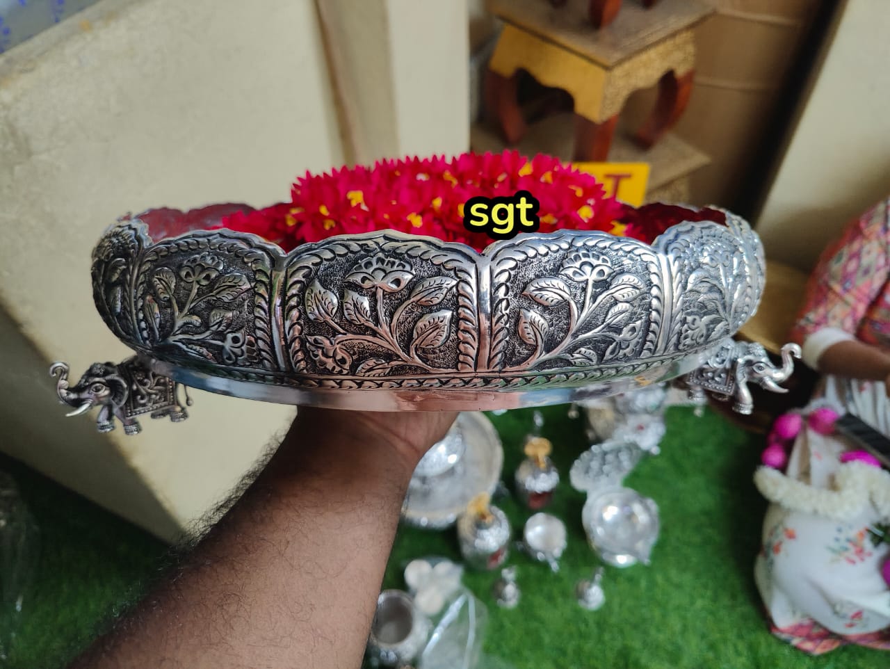 Nayantara, Antique Finish German silver washable elephant leg plate ideal for wedding decor or Pooja decor -SILLA001EL