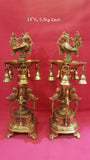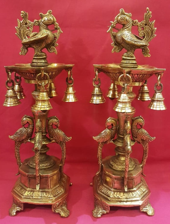 Pair of 2 ,Antique finish heavy hauge Brass lamps/Deepams with Peacock on top decorated with Brass Bells under 5 wicks and 4 parrots on the branch with sqaure shaped bottom stand .