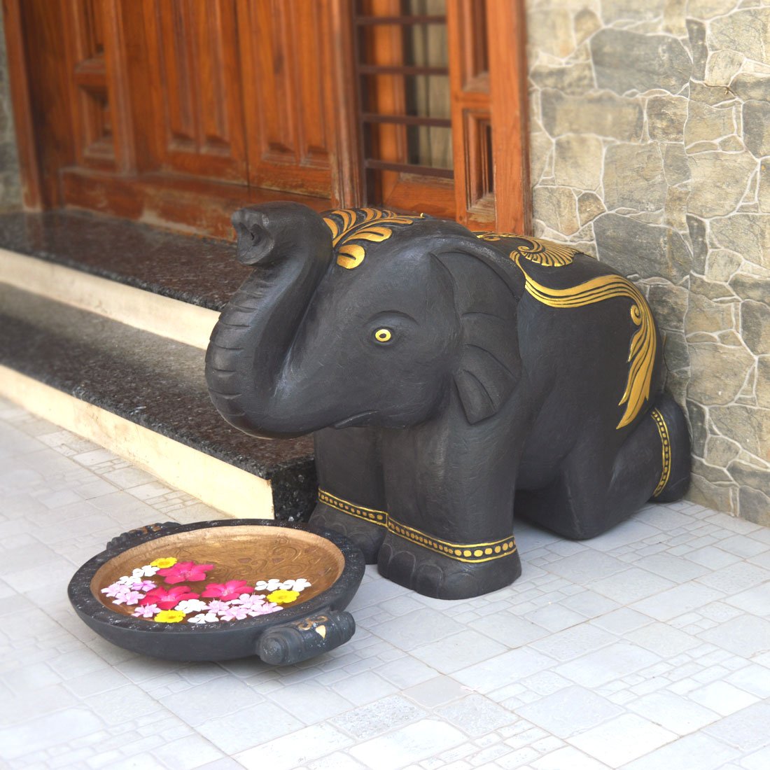 This combo flaunts an elephant sporting uplifted trunks facing the bowl.