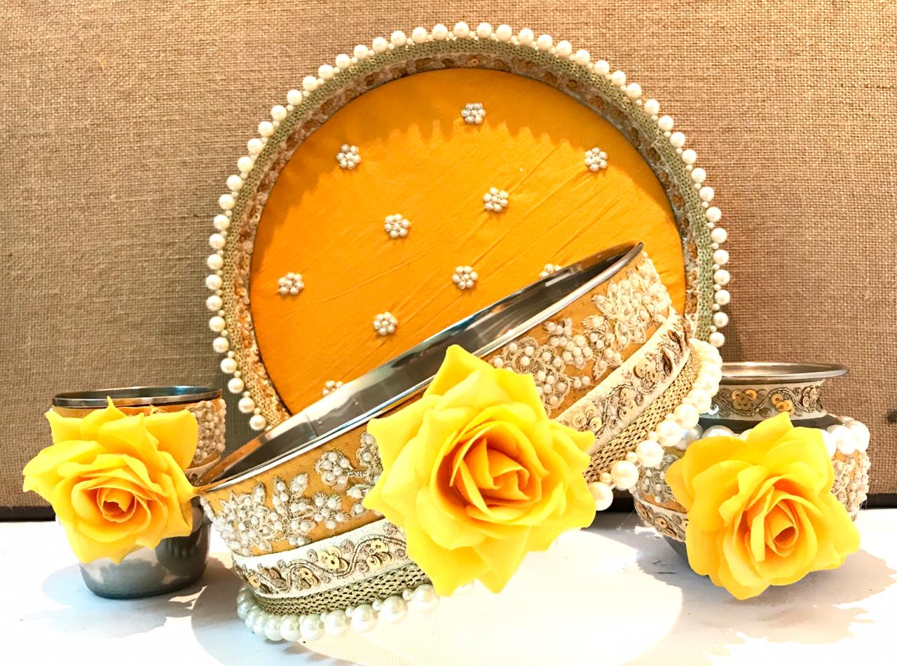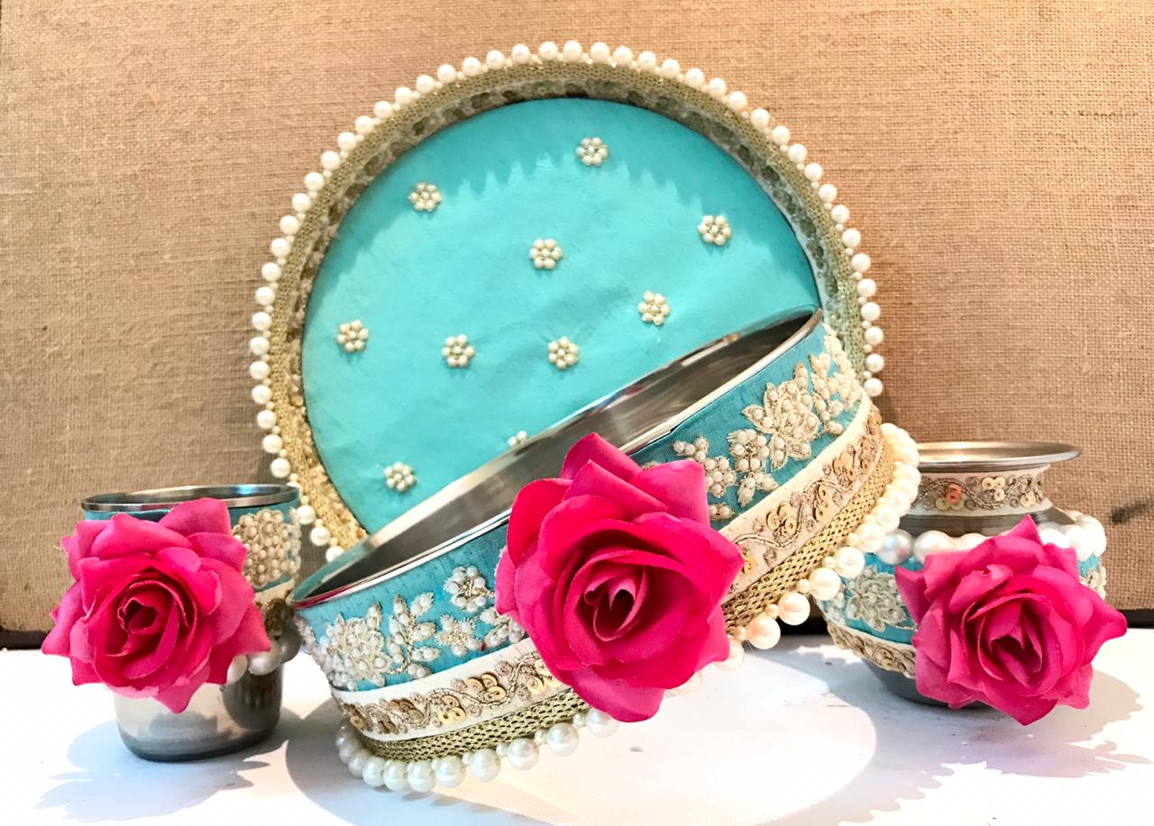 Pearl and Rose inspired Karwachauth sets with pearl handwork on thaali along with the beaded laces