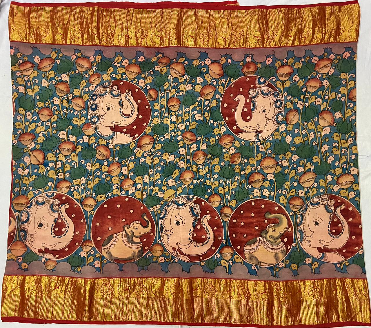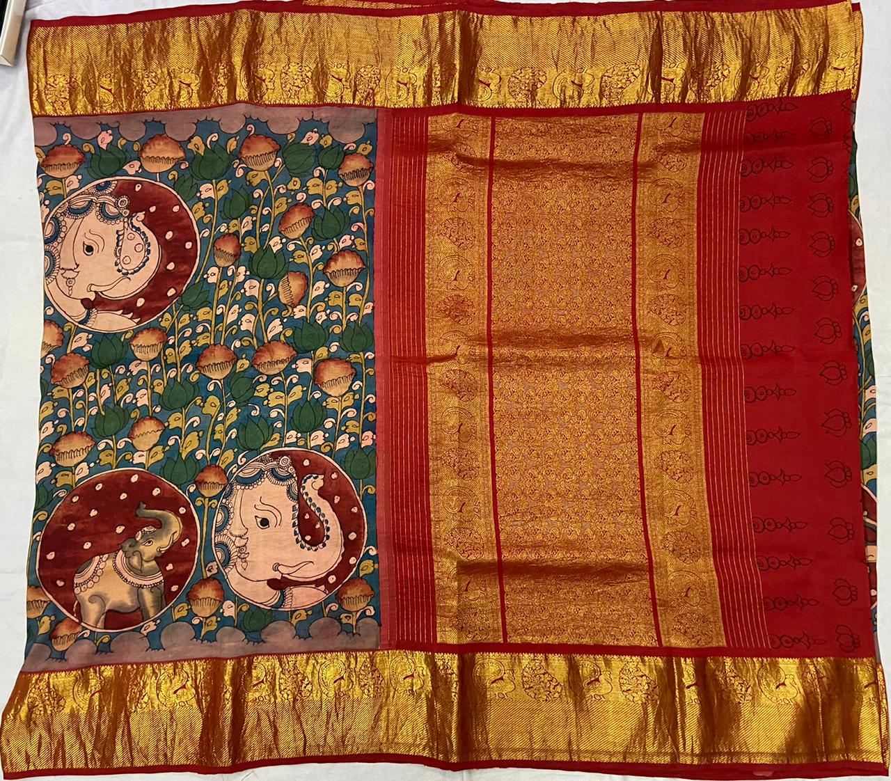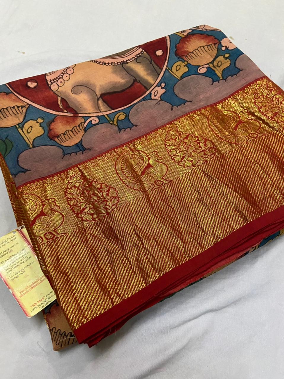 With body hand drawing kalamkari designs with natural organic colors made on silk saree