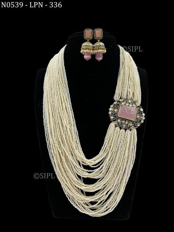 Pink Beauty, elegant Pink Carved Stone pendant Pearl Necklace Set for Women