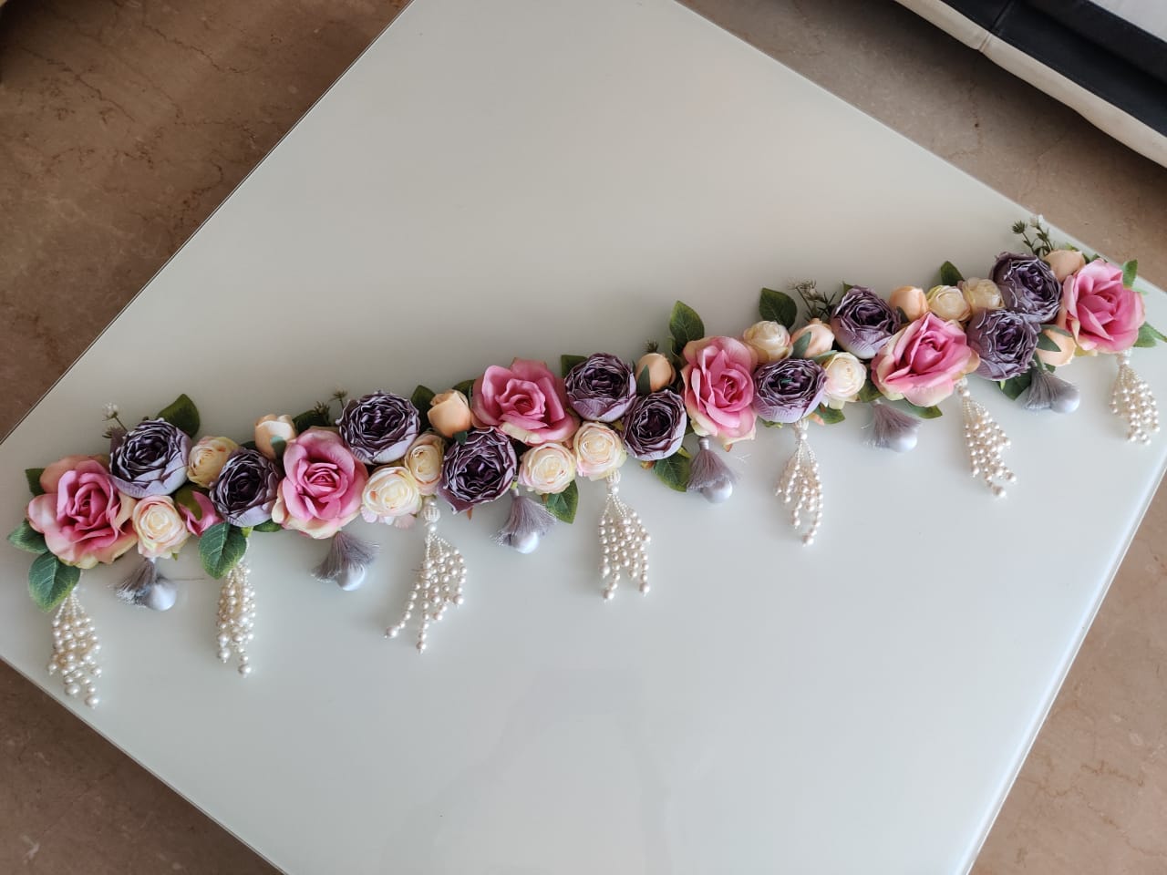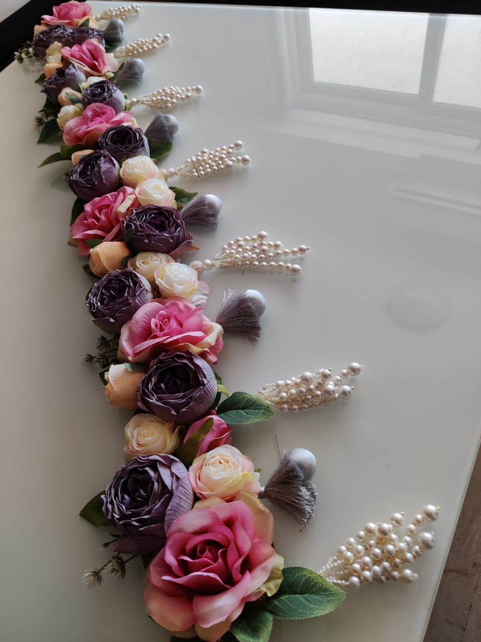 Peonies and rose buds and blooming flower with grey tone ball tassel and moti latkan