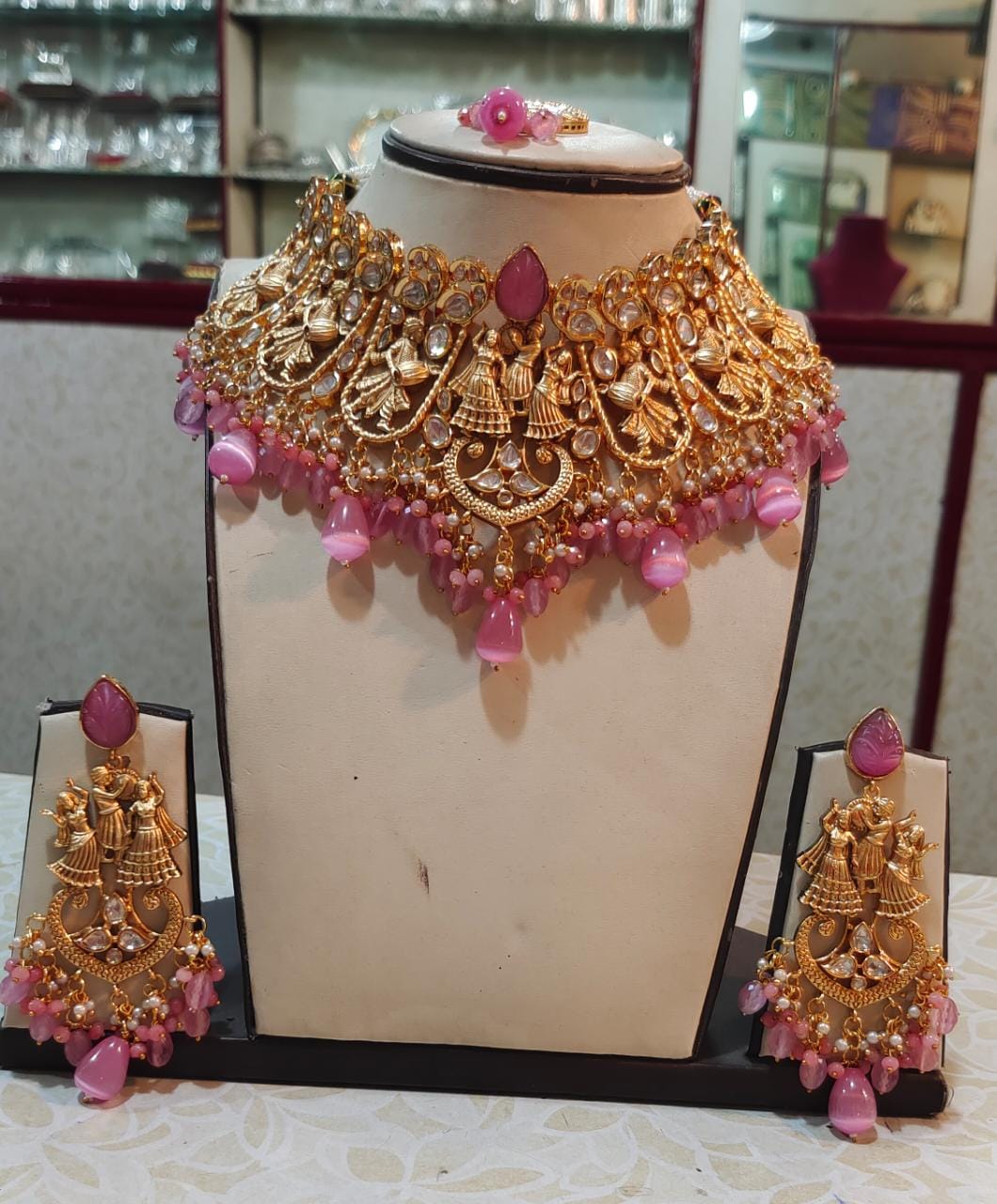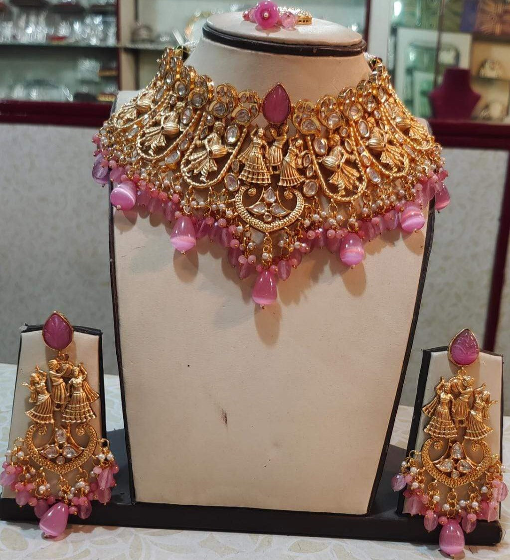 PINK RAJWADA HEAVY MATTE GOLD FINISH BRIDAL CHOKER NECKLACE SET WITH MAANGTIKKA FOR WOMEN