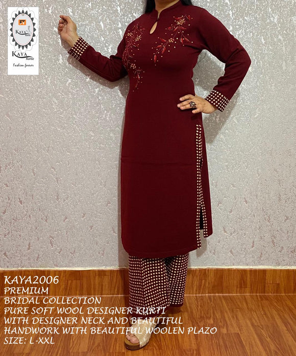 PREMIUM BRIDAL COLLECTION PURE SOFT WOOLLEN DESIGNER KURTI WITH WORK ON NECK AND SLEEVES AND BEAUTIFUL WOOLEN PALAZZO