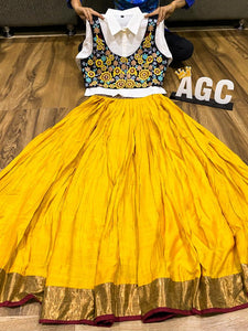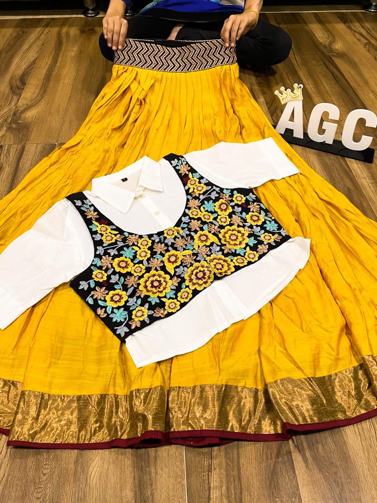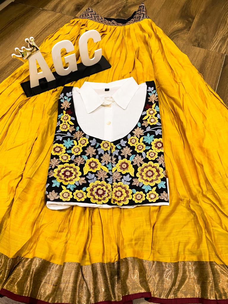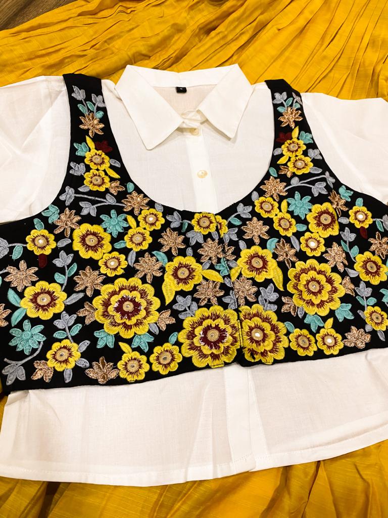 Premium Cotton Shirt Pattern Crop Top with full Embroidery Waist Coat ....... Paired with Beautiful Yellow Silk Skirt with Gold Zari Borders and Maroon Piping Border at ends