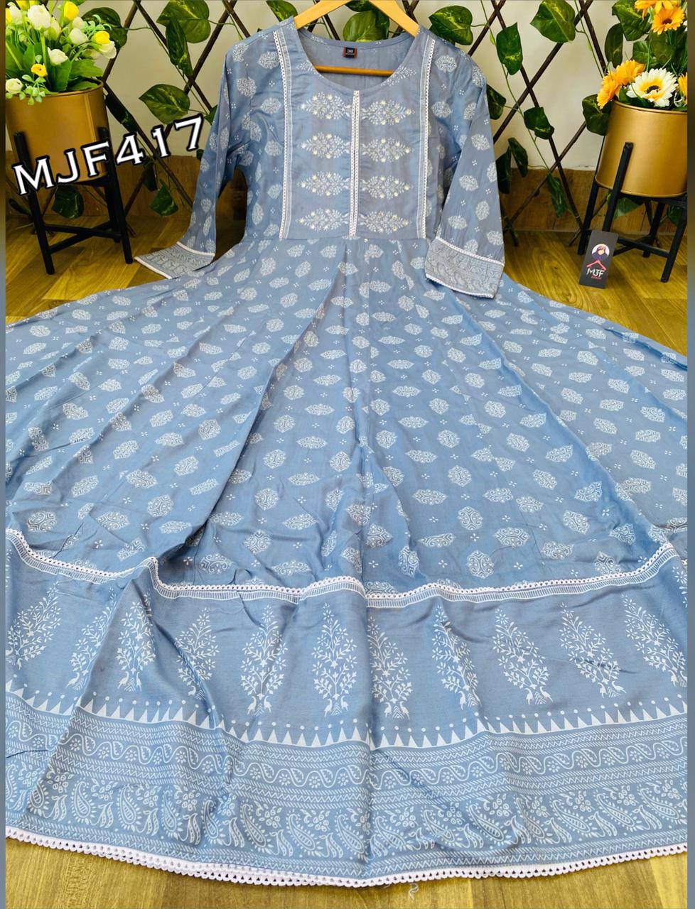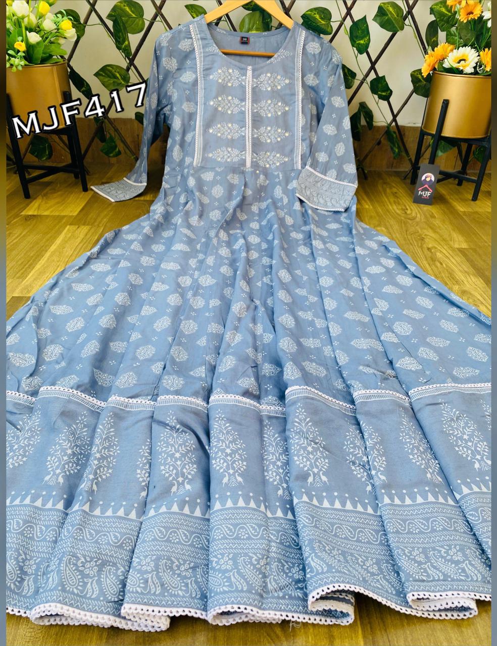 Premium Rayon Full Flare Kali Pattern Gown with Khadi Print Overall and block Print with Gota Detailing