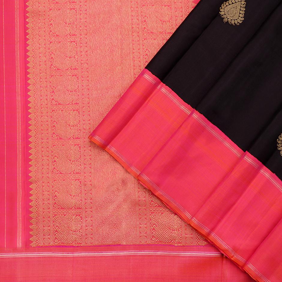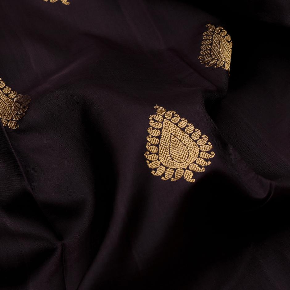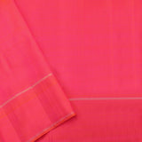This vibrant kanjivaram sari in dark mulberry purple is handwoven with stylised leaf motifs in gold zari ,dotted on the body.The Korvai border in orange shot with pink has stripes n gold zari.The pallu in same colour as the border features geometric band edged by peacock and floral patterns in gold zari.