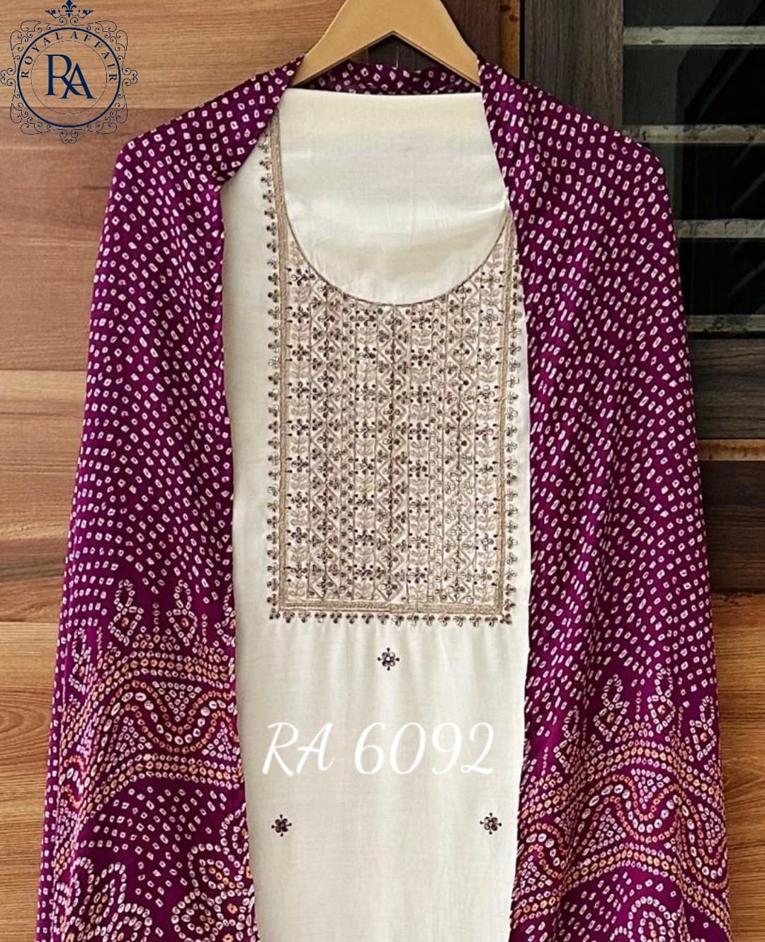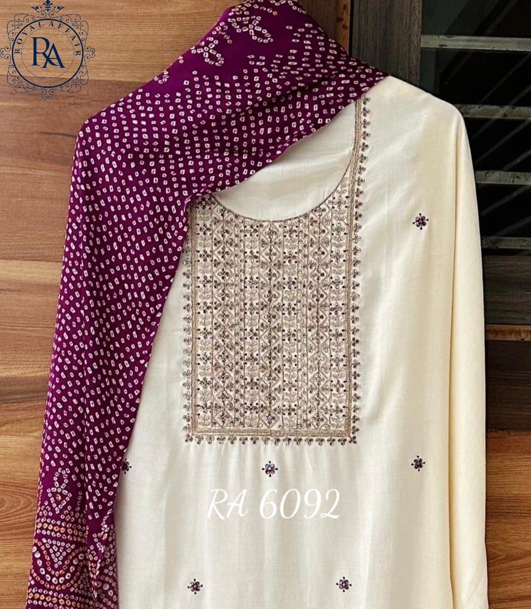 RA 6092 Royal Affair presents pure Russian silk unstitched shirt with beautiful embroidery on neck and bootas all over-ZAIRA001SSM