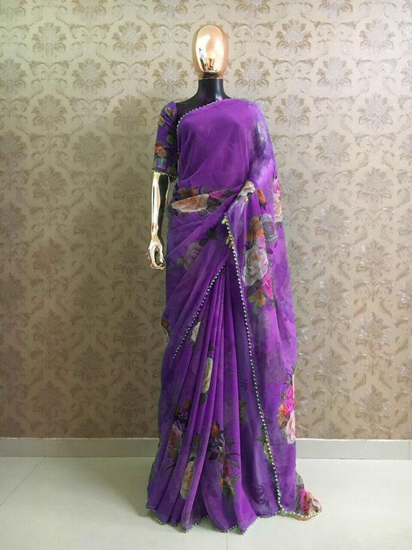 This beautiful printed saree is made from pure Georgette with Digital prins through out the body of the saree.The length of saree is 6.30 metres.Blouse fabric is also digital printed pure georgette material .The Floral printed beautiful Saree comes with moti laces on all four borders and also on the blouse fabric.This saree will be ideal for women on heavier side as the soft drapes will make you look slimmer and more elegant .