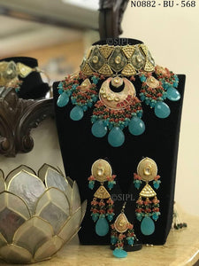 SEA BLUE DROPLET BEADS MEENAKARI KUNDAN HEAVY BRIDAL NECKLACE SET FOR WOMEN-GANNHNS001SB