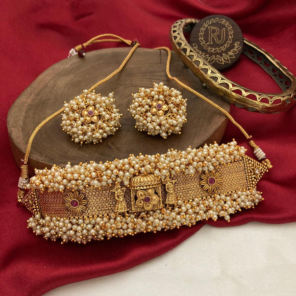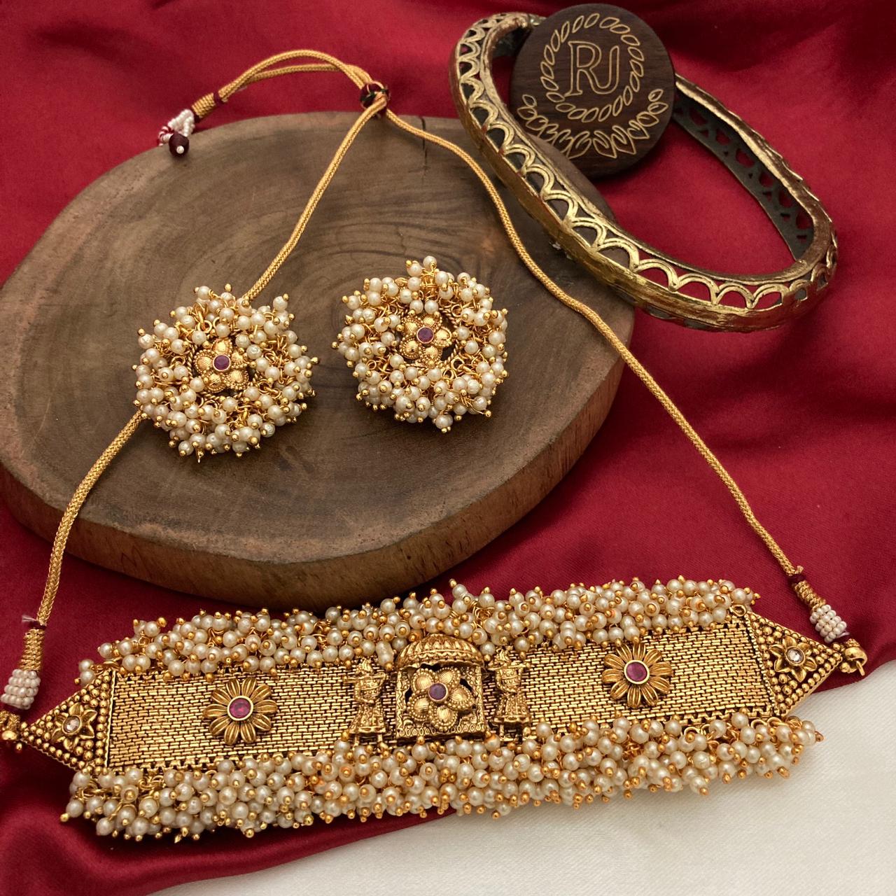 MATTE GOLD FINISH PEARL CHOKER NECKLACE SET FOR WOMEN