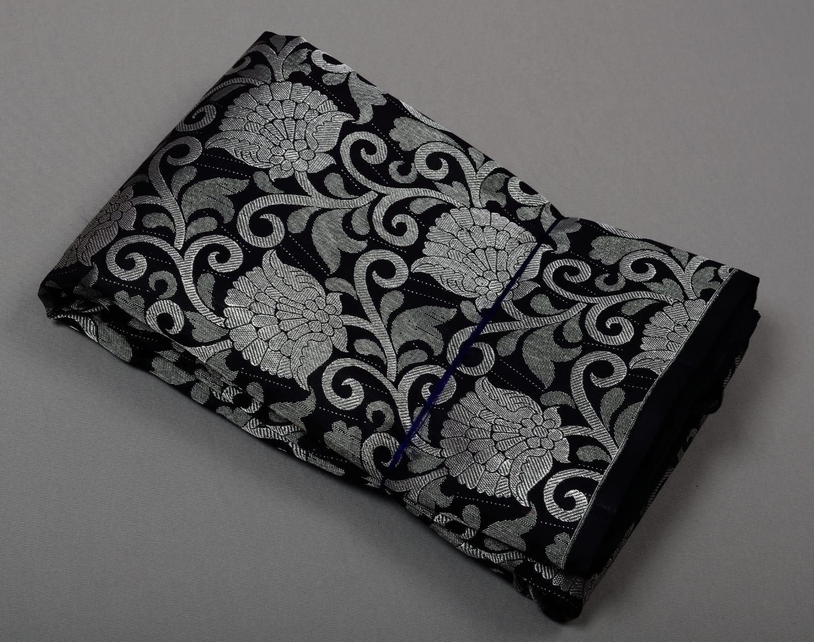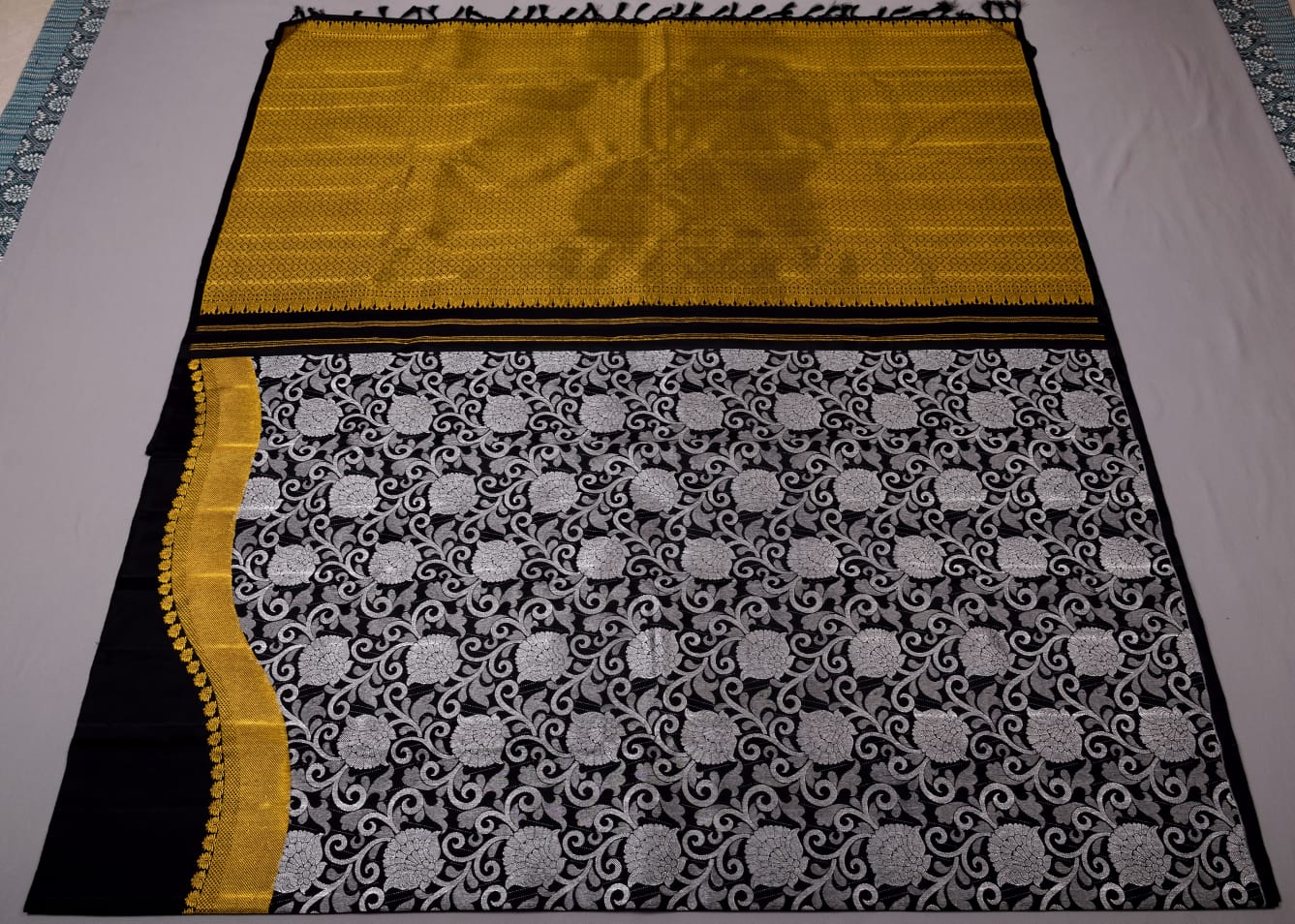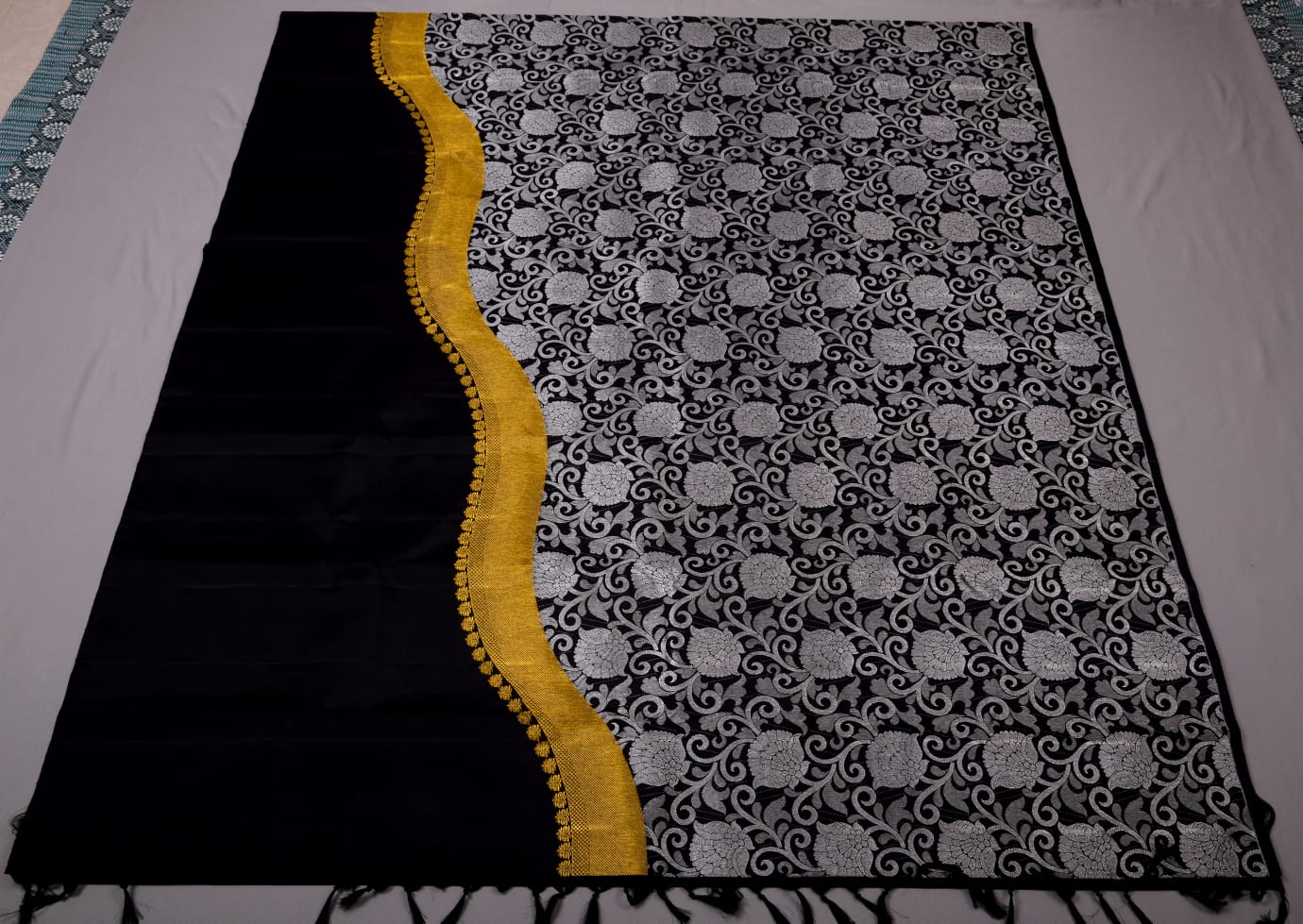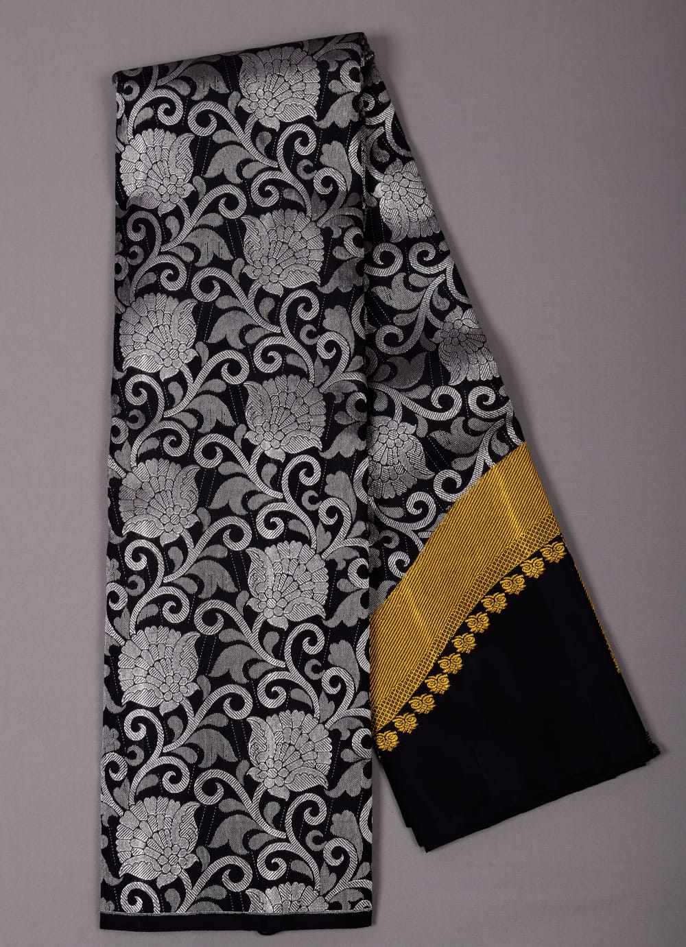 Kanchipuram Handloom Pure Silk Saree in Black color, and with Beautiful silver designs at bottom , Raising Zari designs from down to top