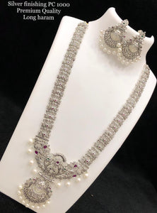 SILVER FINISH PREMIUM QUALITY LONG HAARAM/LONG NECKLACE WITH RUBIES AND PEARLS AND MATCHING EARRINGS FOR Women .