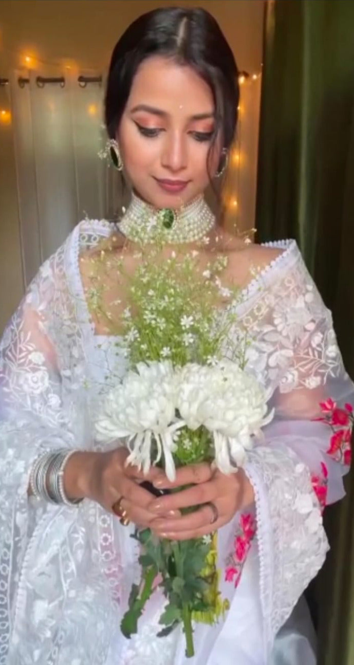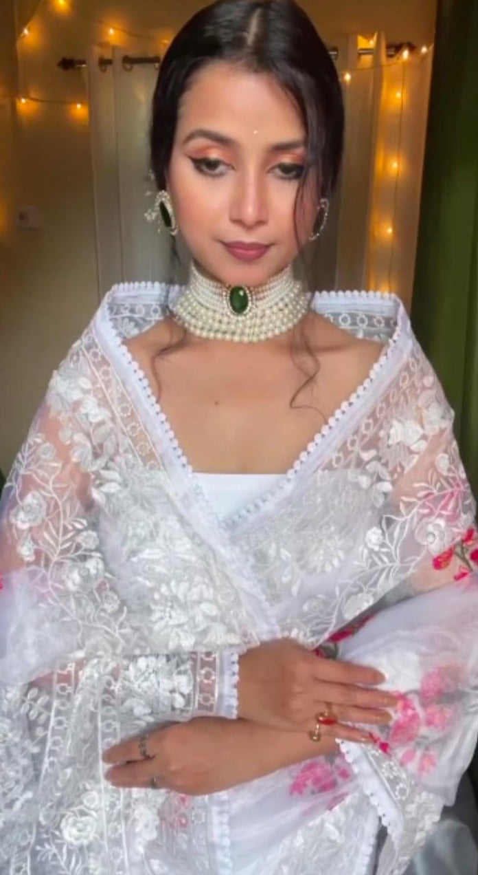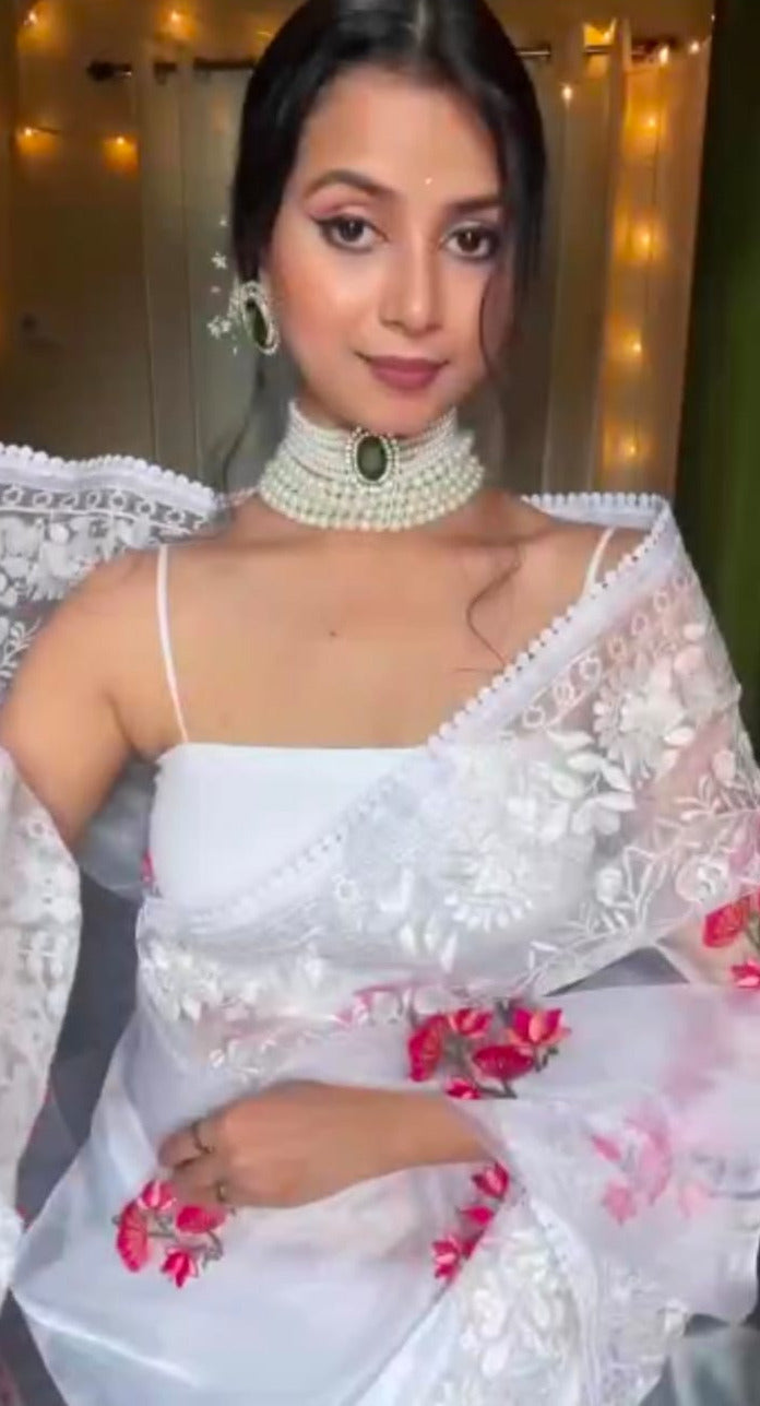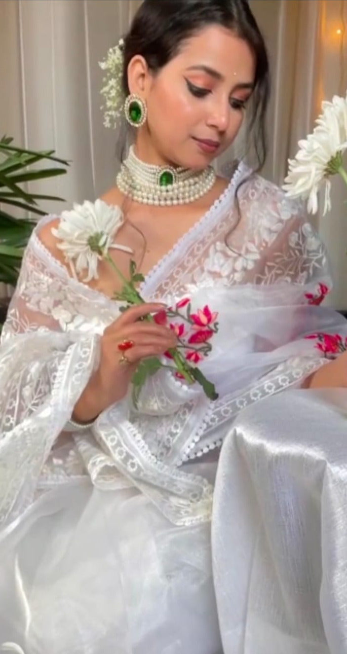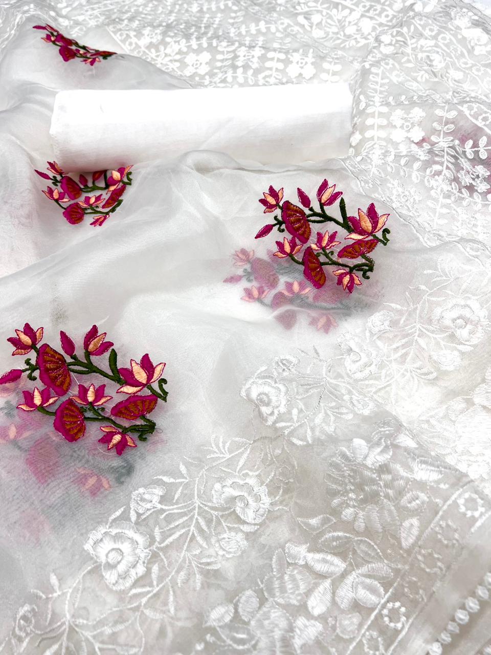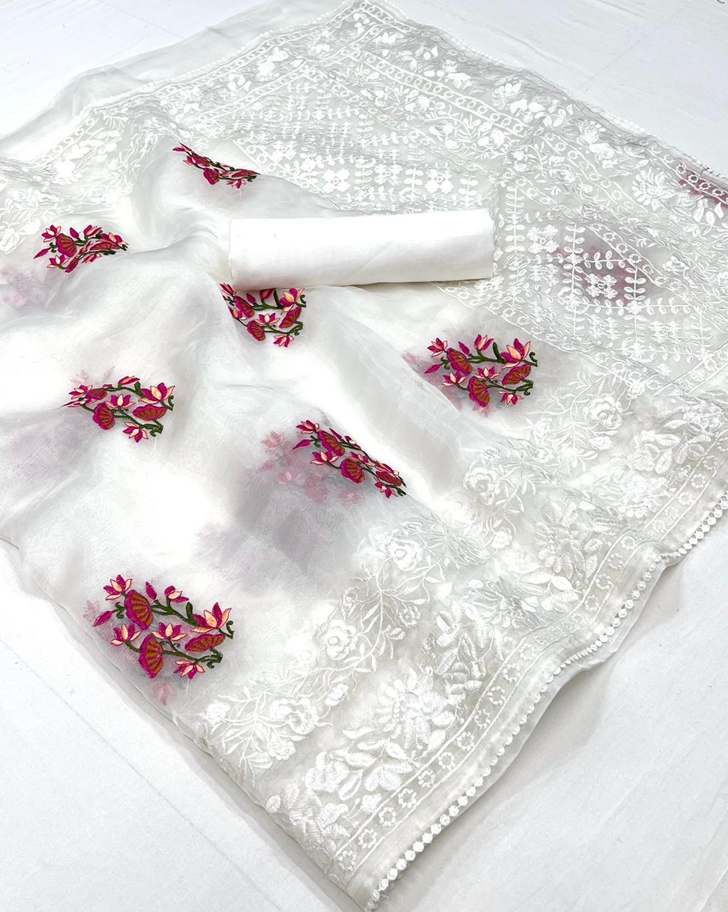 Super Hit White Organza Saree with floral Embroidery work -SHREE001WS