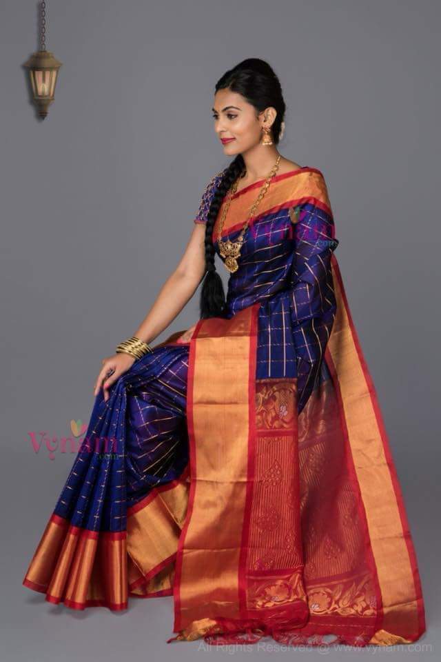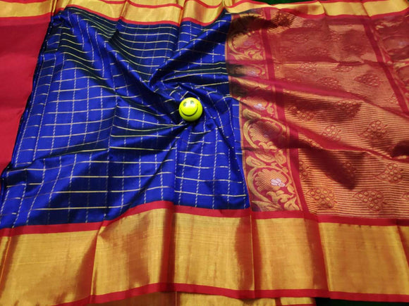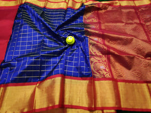 Blue chequered saree with red pallu and borders with real gold Jari.