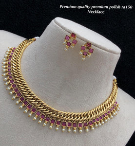 This Vanitha necklace set for women features an elegant matte gold design, offering a timeless and sophisticated look. Made with high-quality materials, this set is durable and perfect for any occasion. Elevate your style with this exquisite piece that exudes both elegance and grace.