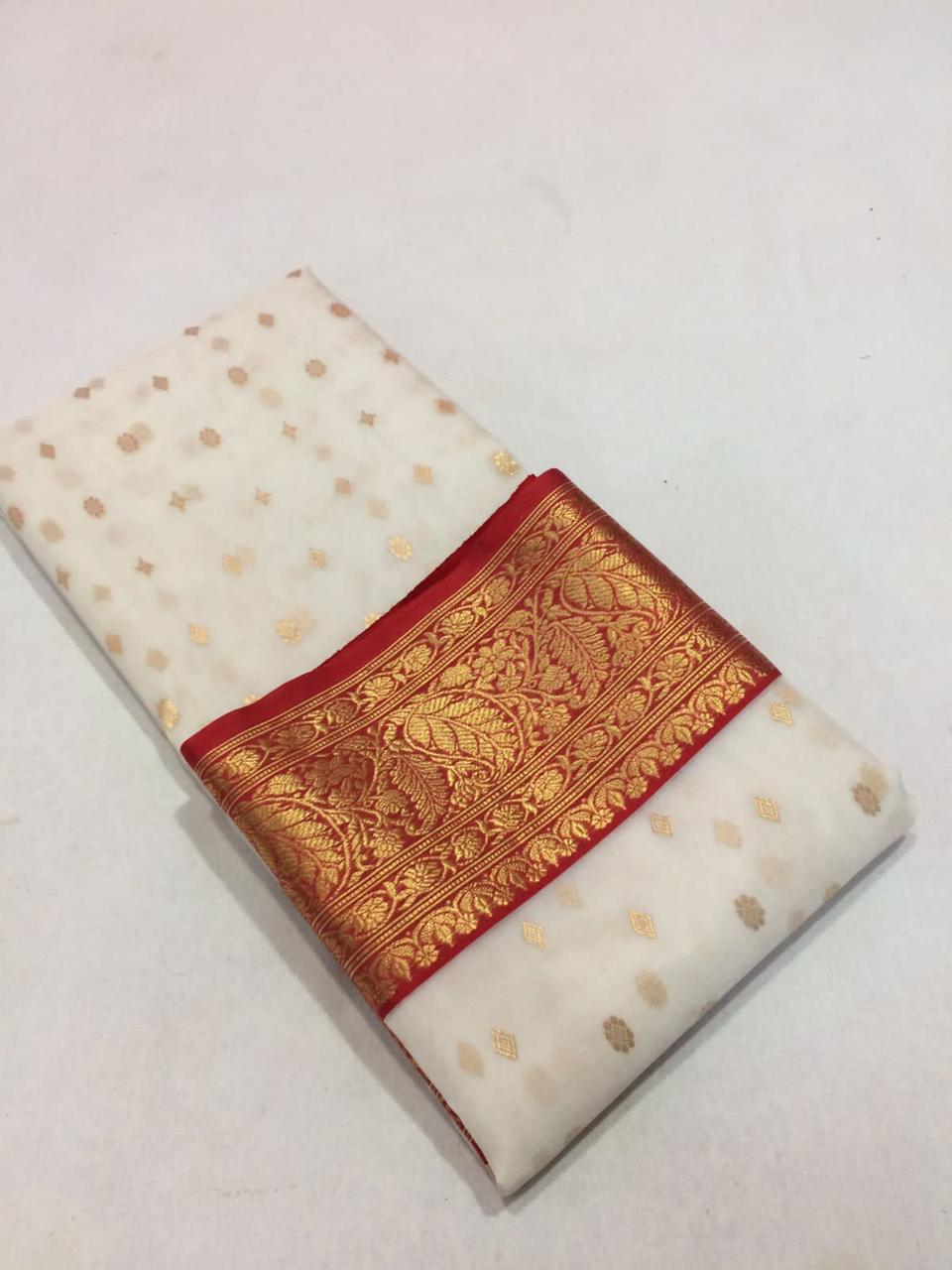 WHITE AND RED TRADITIONAL ORIGINAL AUTHENTIC KATAN SILK SAREE FOR WOMEN -SHABI001RW