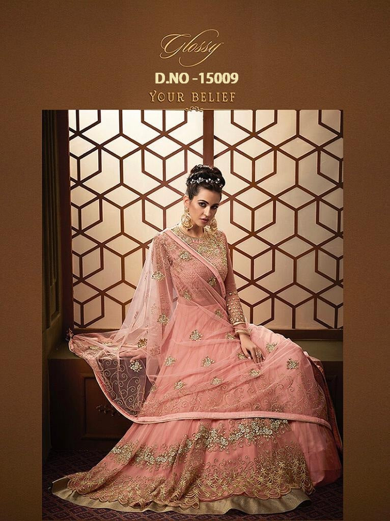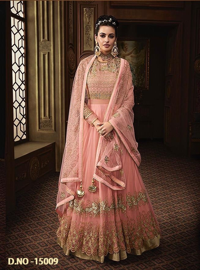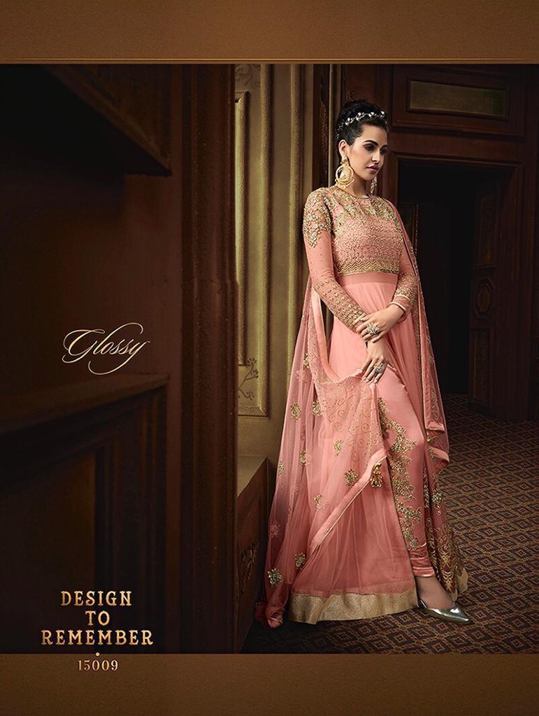 Semi stitched Blossom Pink Gown from Glossy Majesty Bridal wear for women collection with beautiful net Duppatta and gold embedded all over the body.
